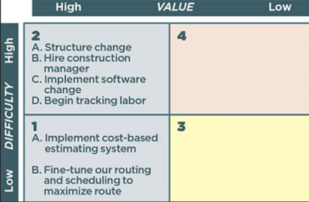 Change, as illustrated in the figure below, can be lumped into four distinct quadrants based on two key factors: value and difficulty. These quadrants are: